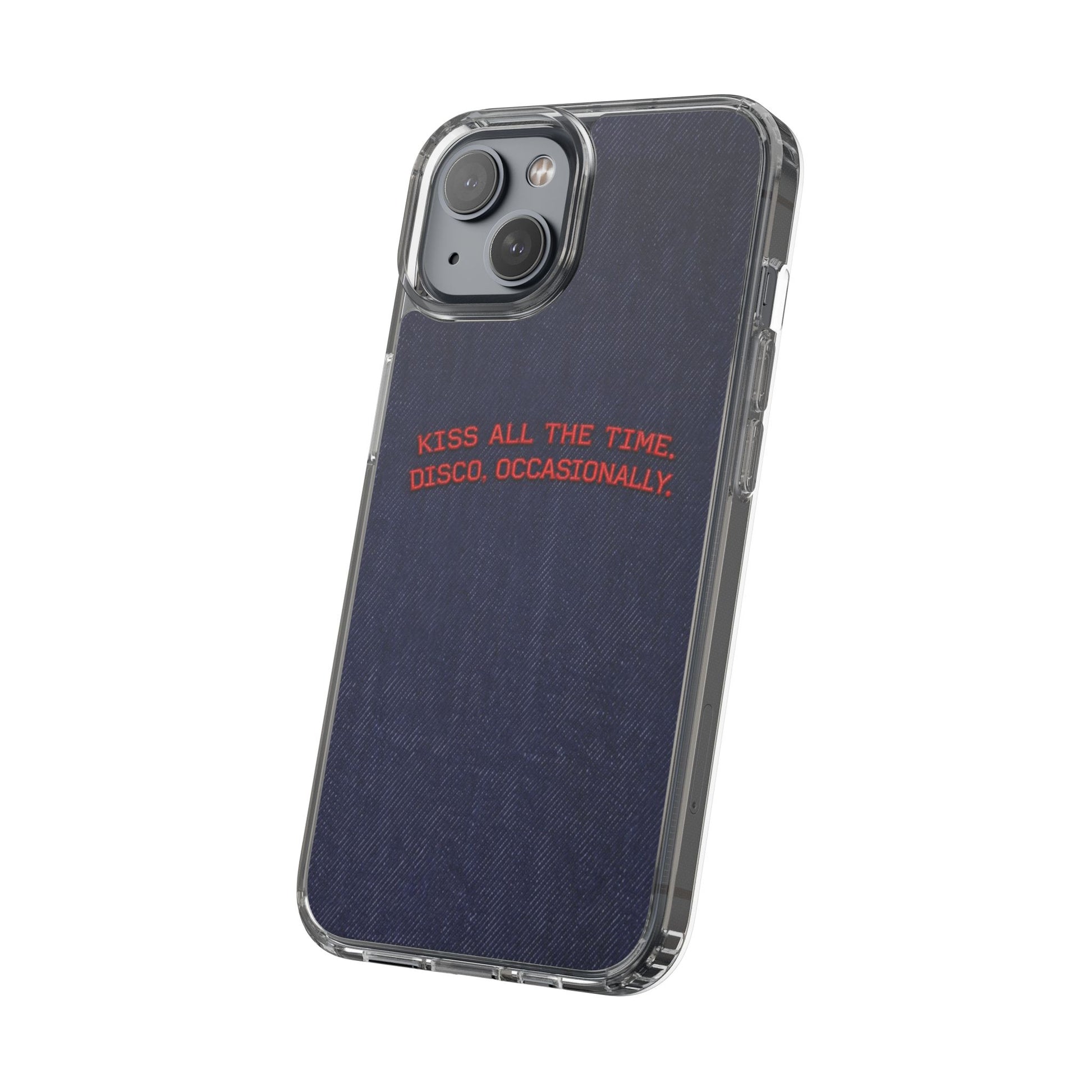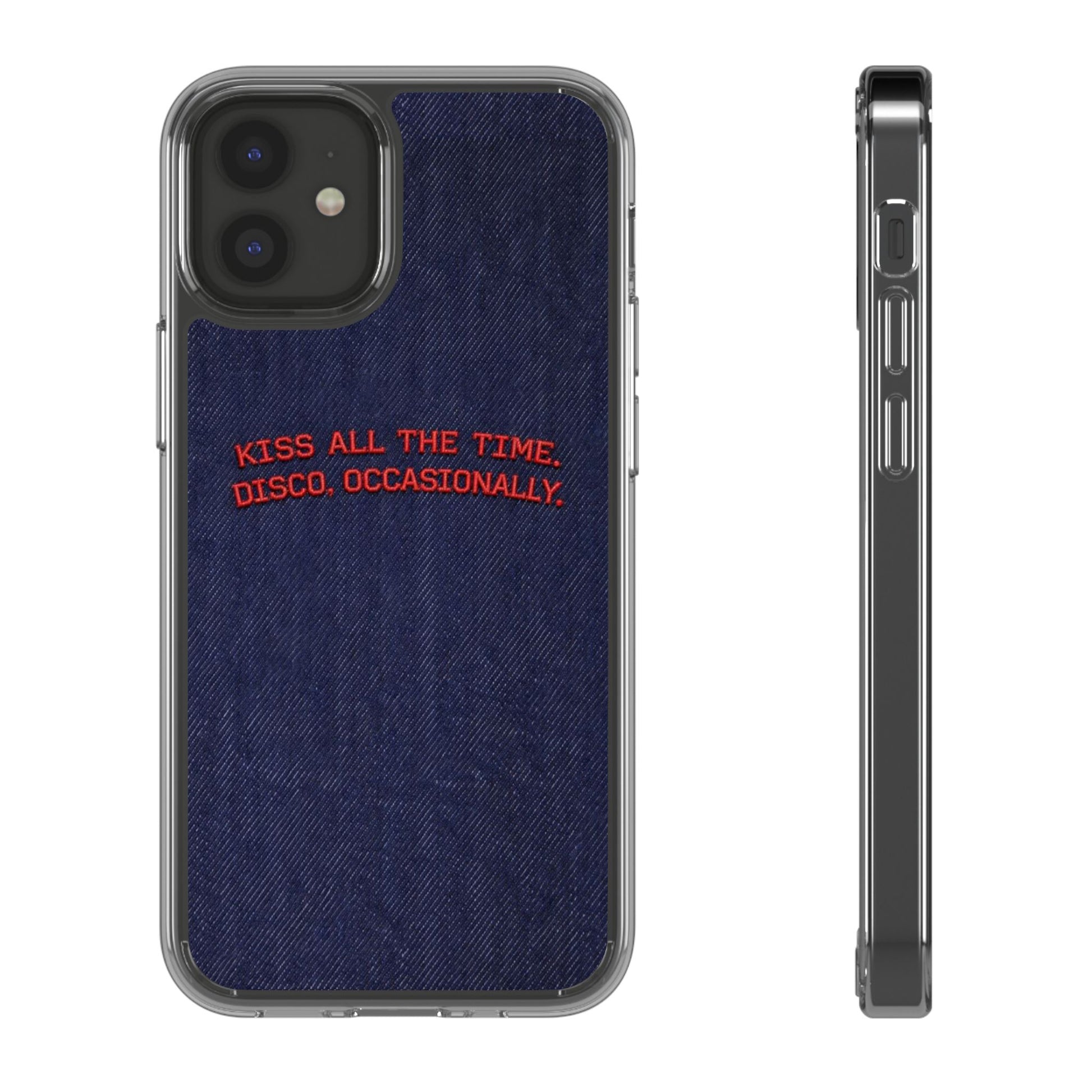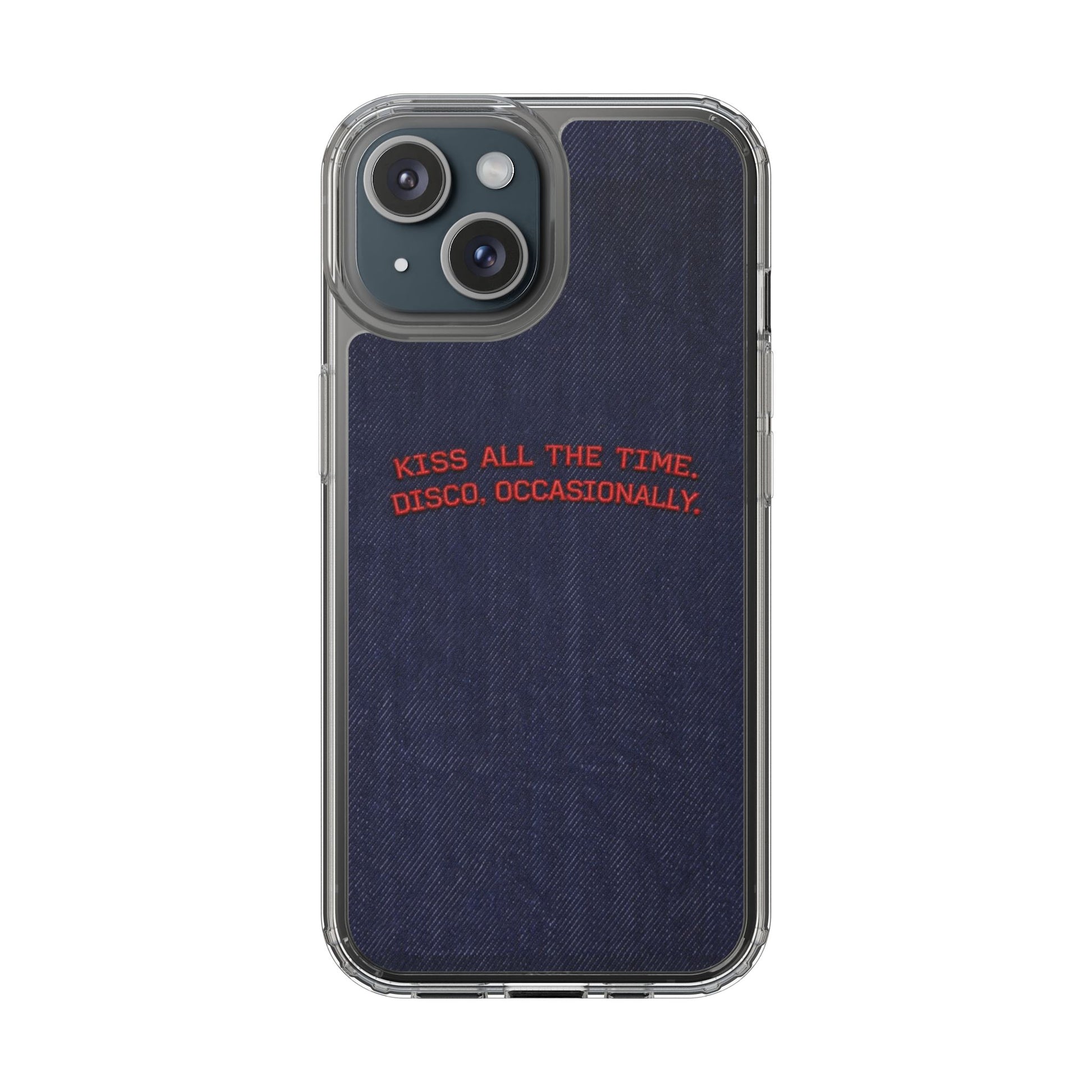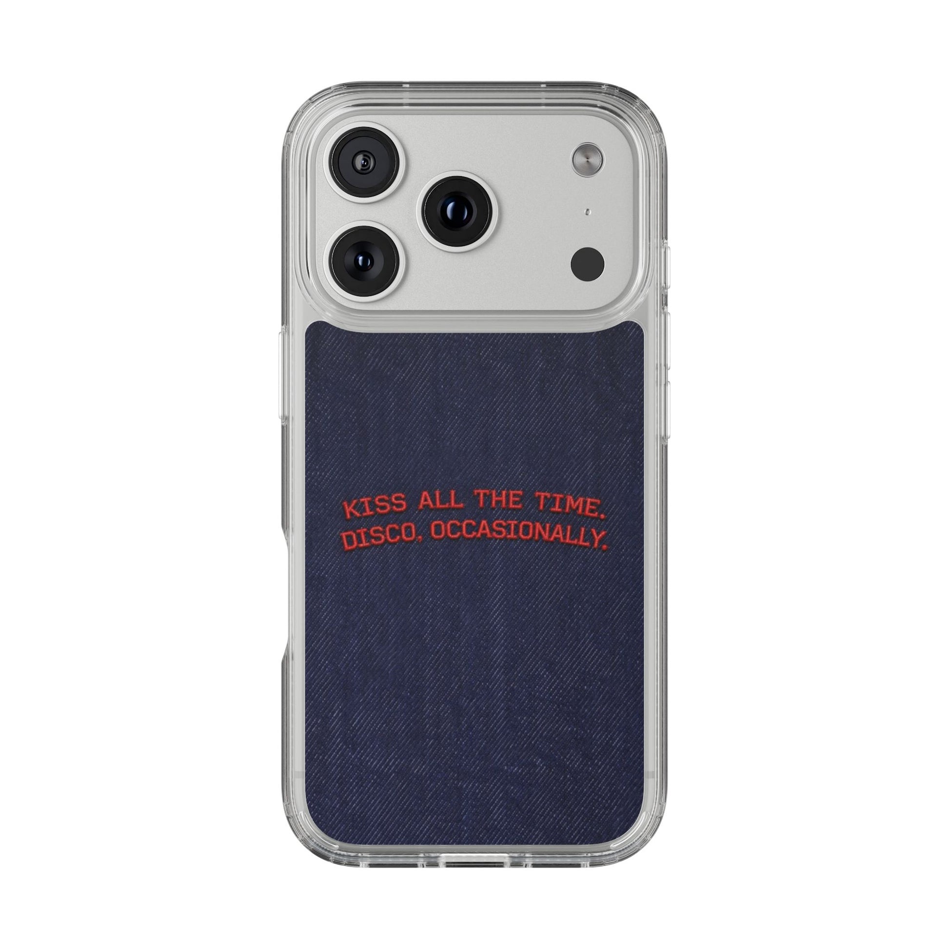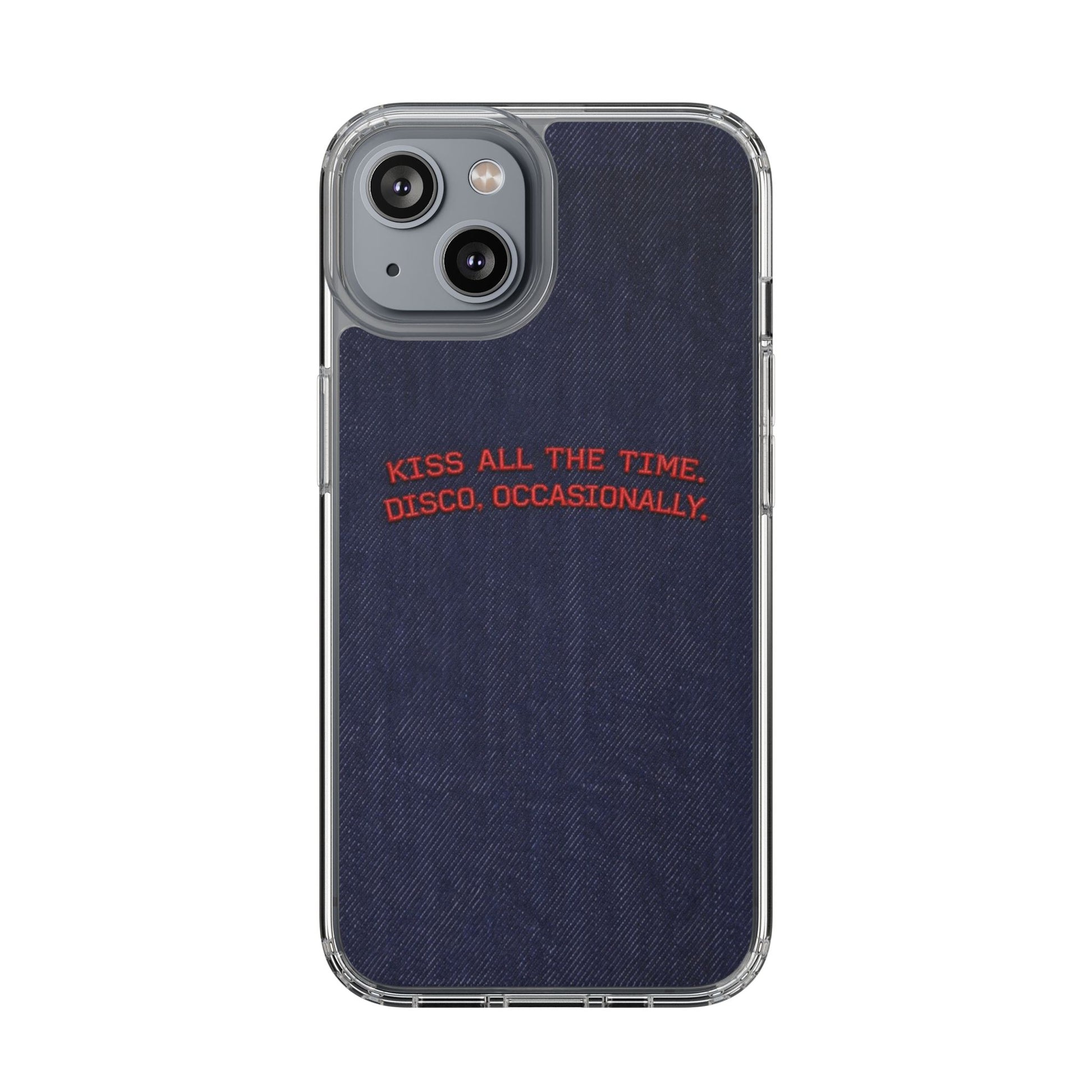 A slim, clear phone case with a deep denim backdrop and bold red embroidered text that reads: “KISS ALL THE TIME. DISCO, OCCASIONALLY.” It balances playful romance with retro flair — the clear TPU sides and polycarbonate back keep the phone lightweight and protected while letting the embroidery-style design pop. This case slips into everyday life easily: it cushions against drops, resists scratches, and supports wireless charging so you’re never uncomfortably tethered. Finished with precise cutouts and a subtle glossy frame, it’s a small, tactile reminder to keep things joyful and a little bit nostalgic every time you reach for your phone.
