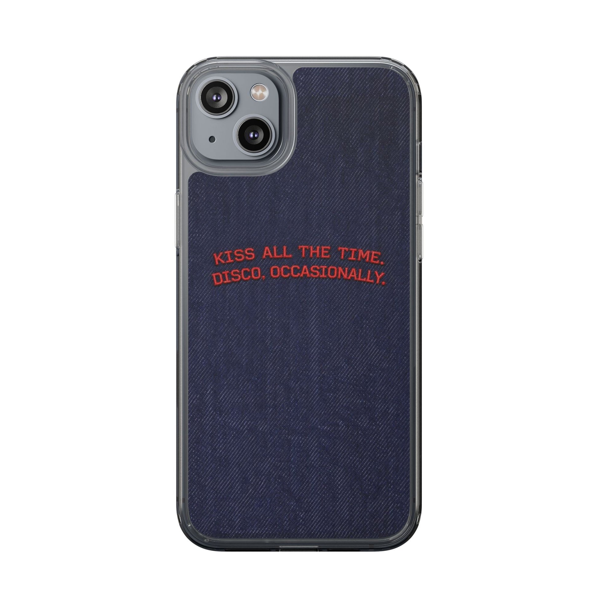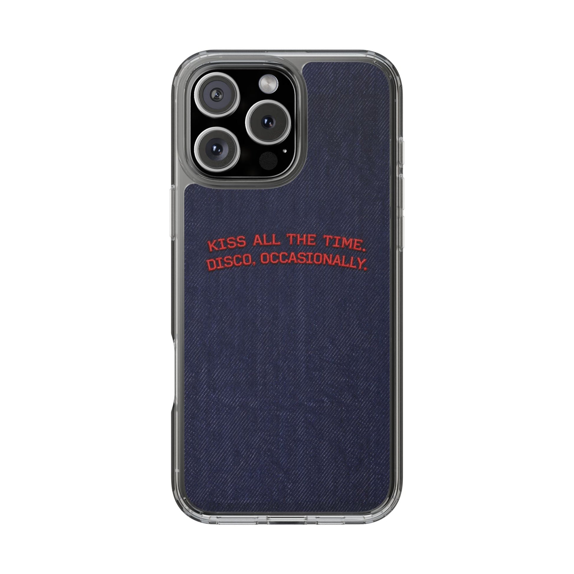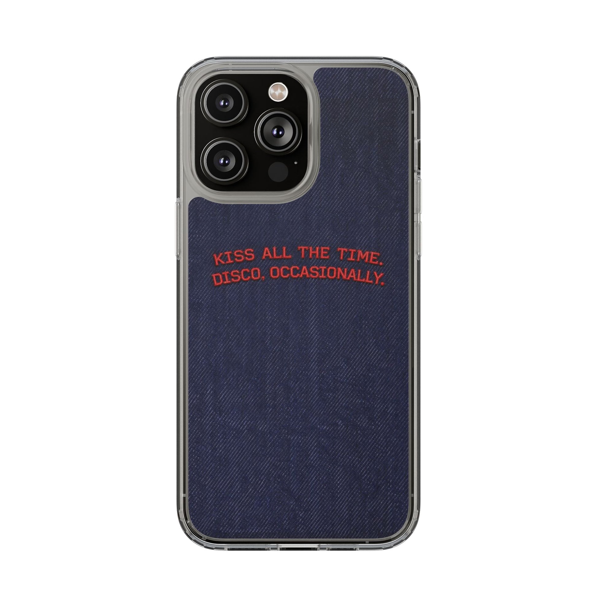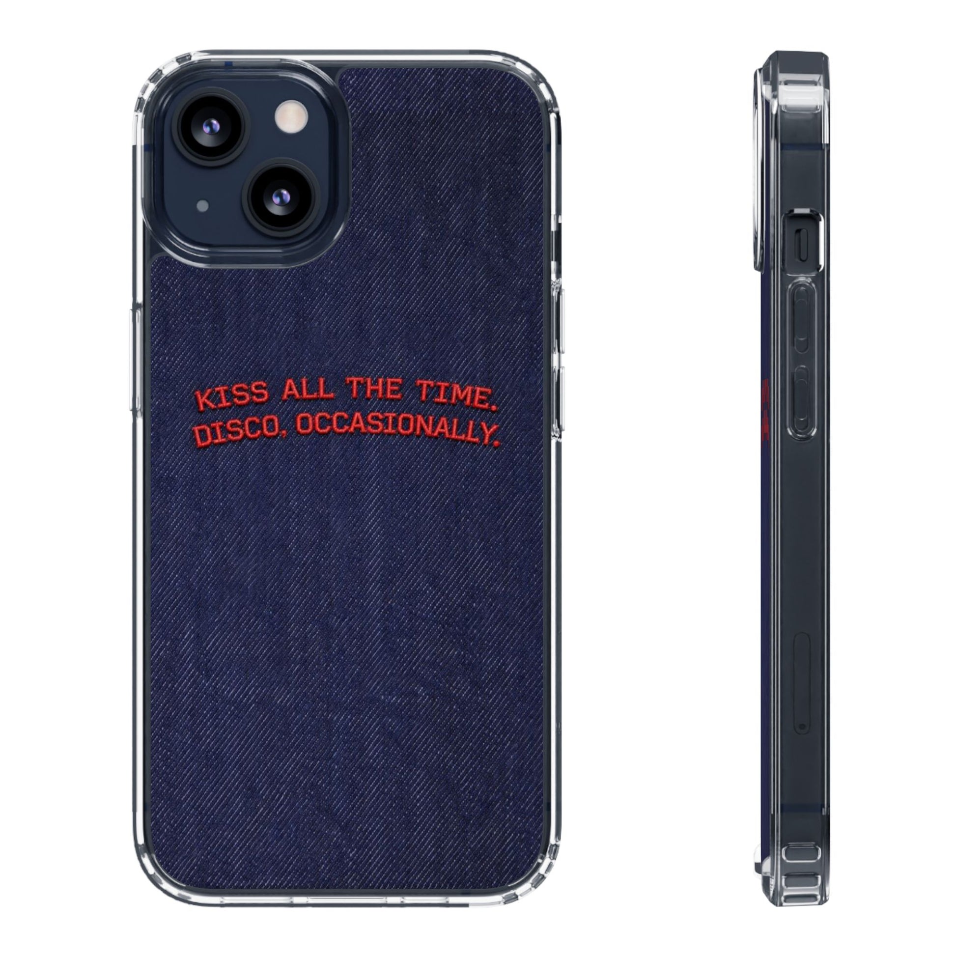 A slim, clear phone case with a deep denim backdrop and bold red embroidered text that reads: “KISS ALL THE TIME. DISCO, OCCASIONALLY.” It balances playful romance with retro flair — the clear TPU sides and polycarbonate back keep the phone lightweight and protected while letting the embroidery-style design pop. This case slips into everyday life easily: it cushions against drops, resists scratches, and supports wireless charging so you’re never uncomfortably tethered. Finished with precise cutouts and a subtle glossy frame, it’s a small, tactile reminder to keep things joyful and a little bit nostalgic every time you reach for your phone.