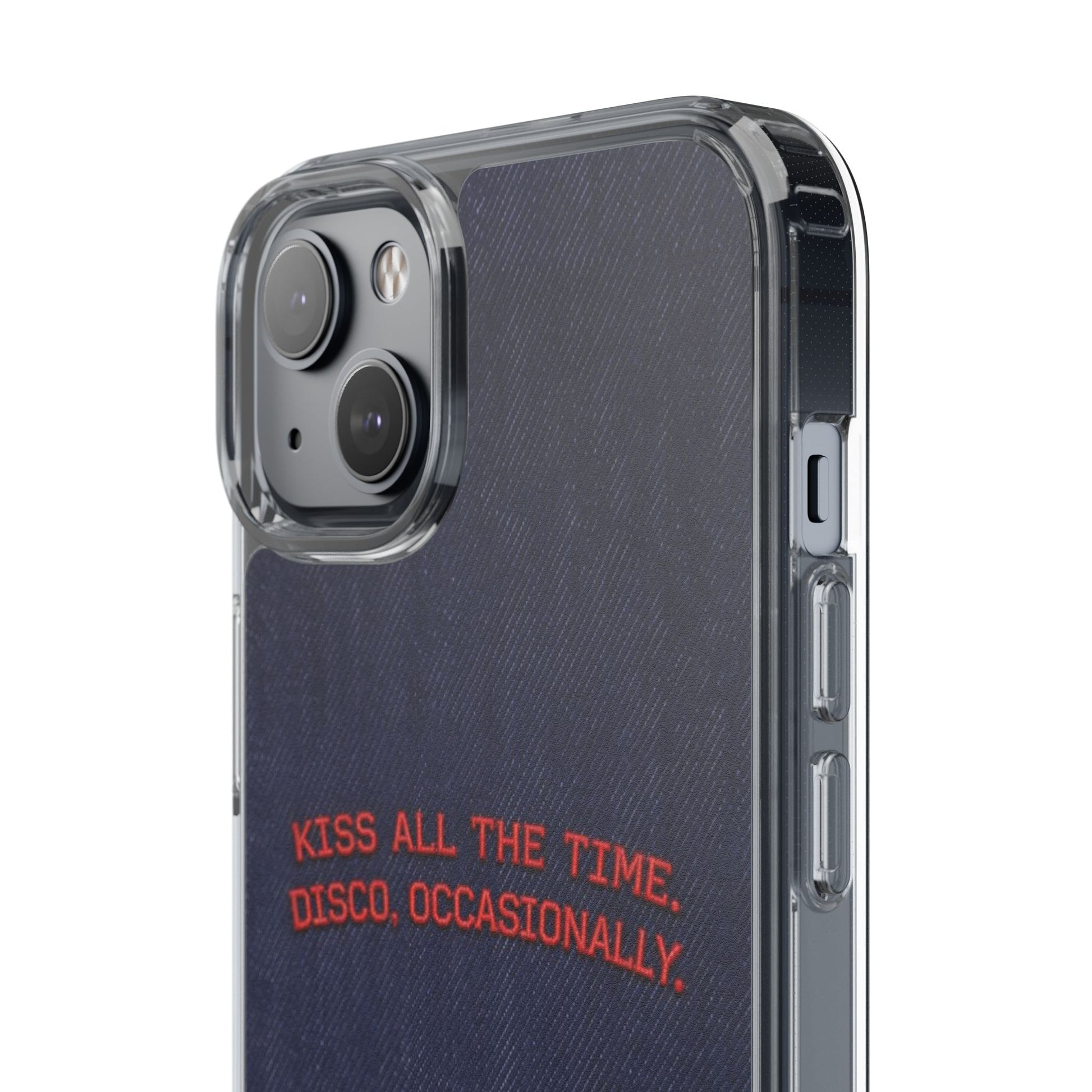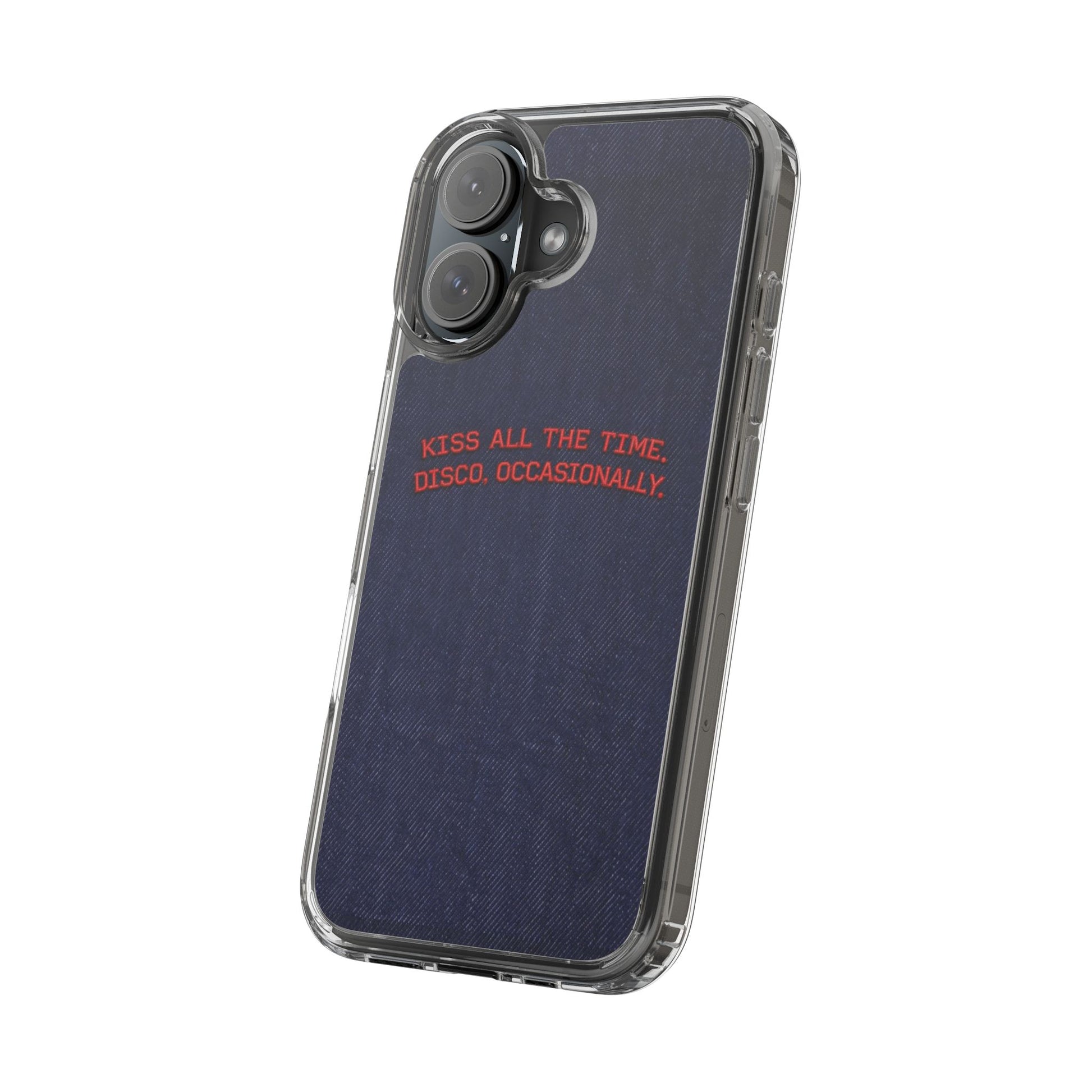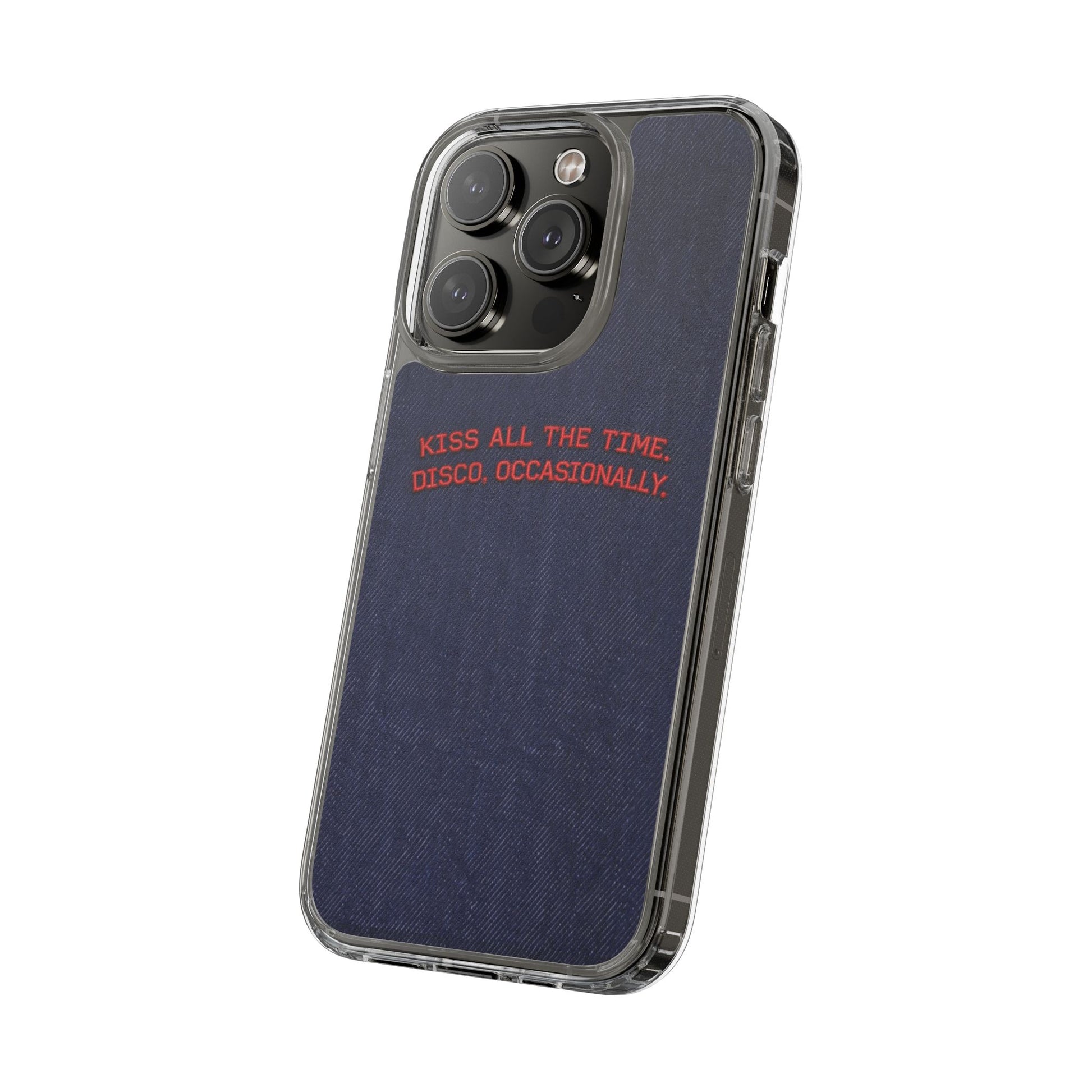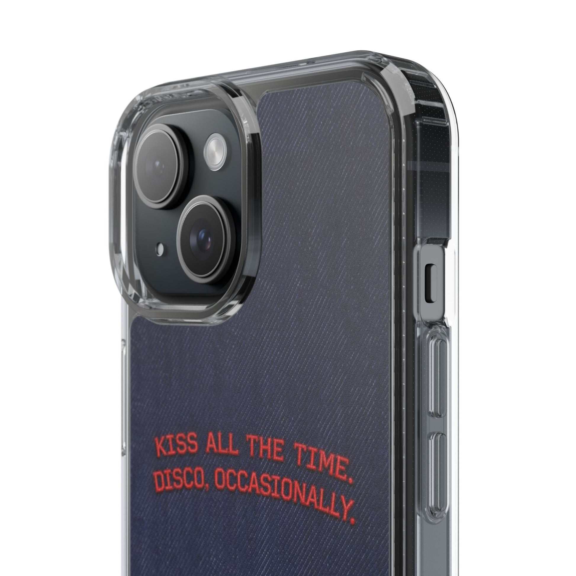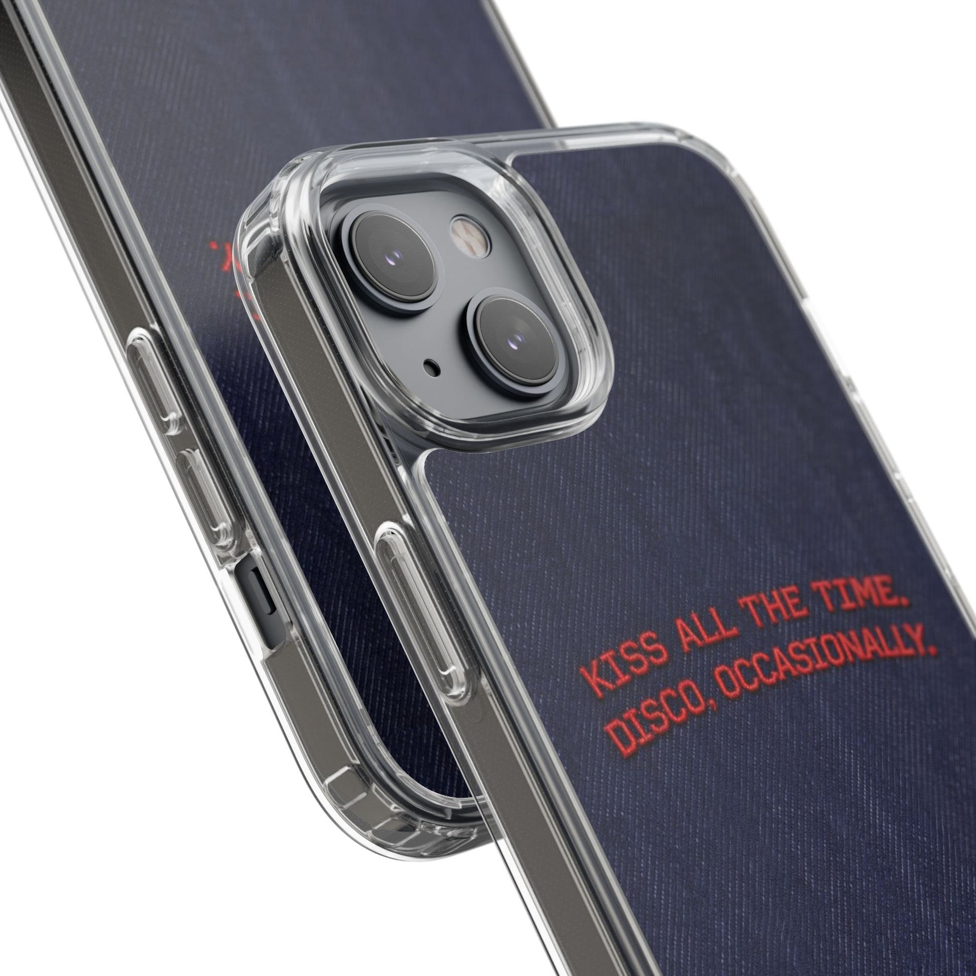 A slim, clear phone case with a deep denim backdrop and bold red embroidered text that reads: “KISS ALL THE TIME. DISCO, OCCASIONALLY.” It balances playful romance with retro flair — the clear TPU sides and polycarbonate back keep the phone lightweight and protected while letting the embroidery-style design pop. This case slips into everyday life easily: it cushions against drops, resists scratches, and supports wireless charging so you’re never uncomfortably tethered. Finished with precise cutouts and a subtle glossy frame, it’s a small, tactile reminder to keep things joyful and a little bit nostalgic every time you reach for your phone.