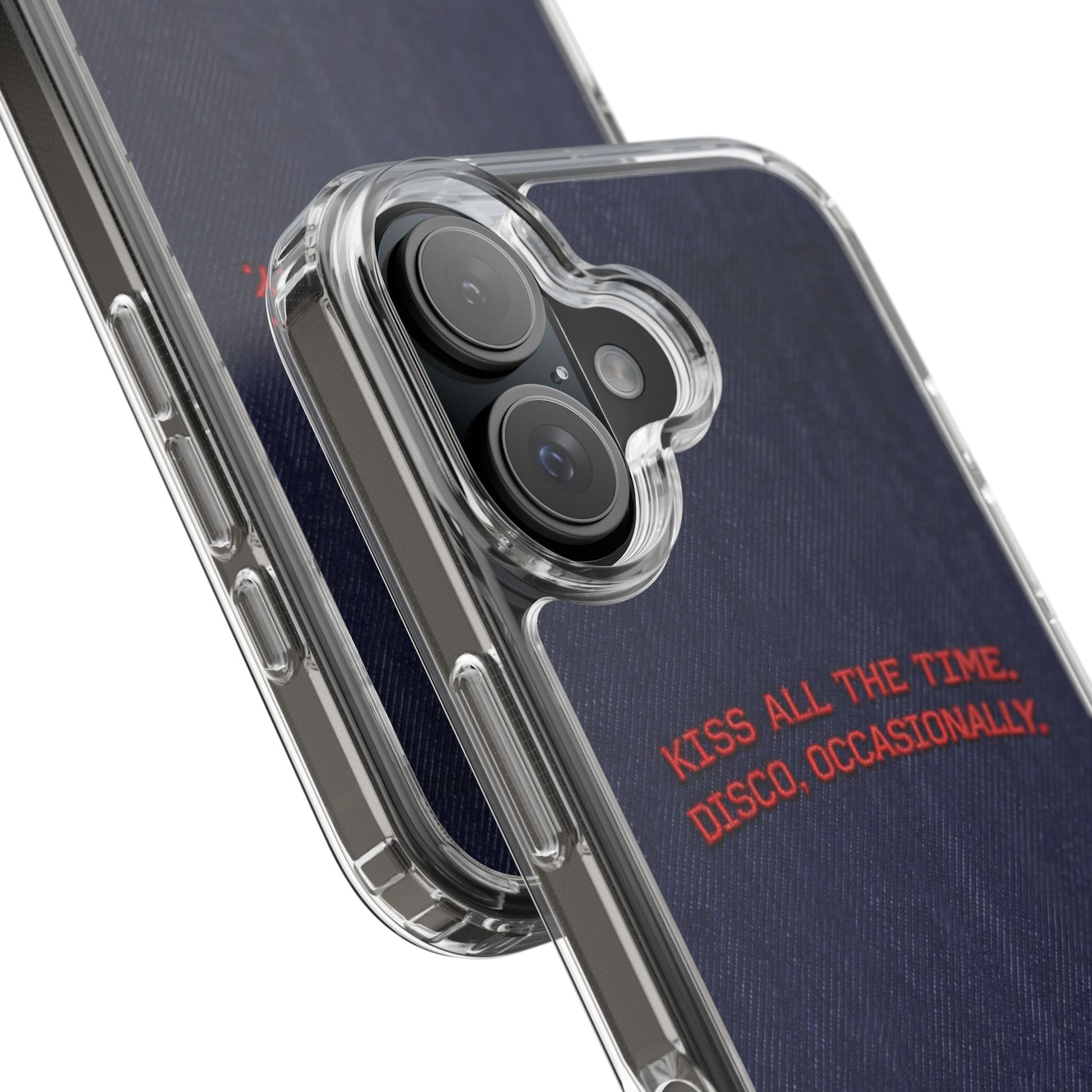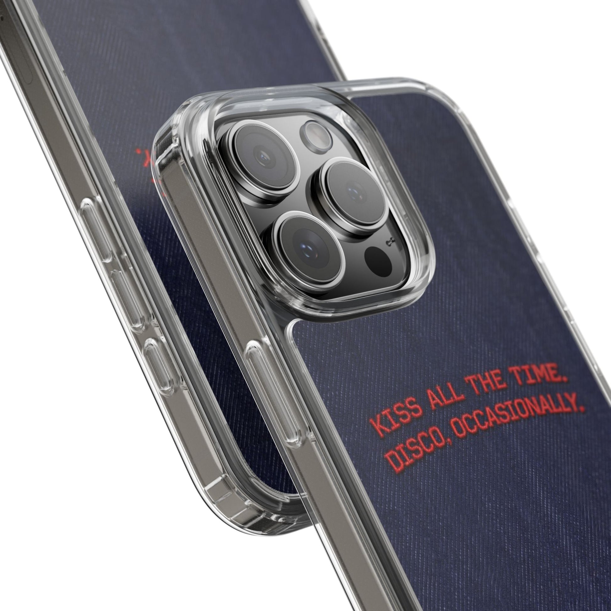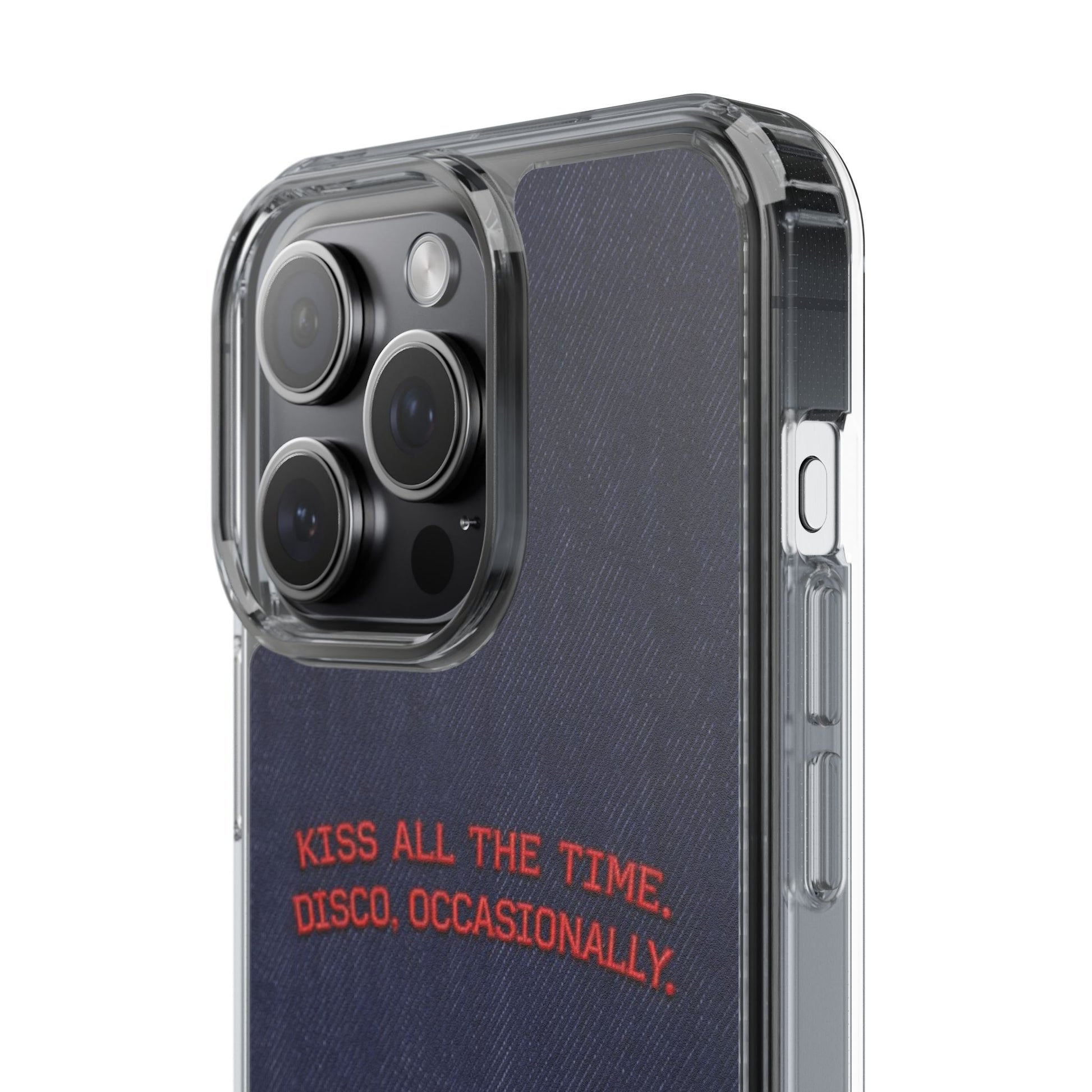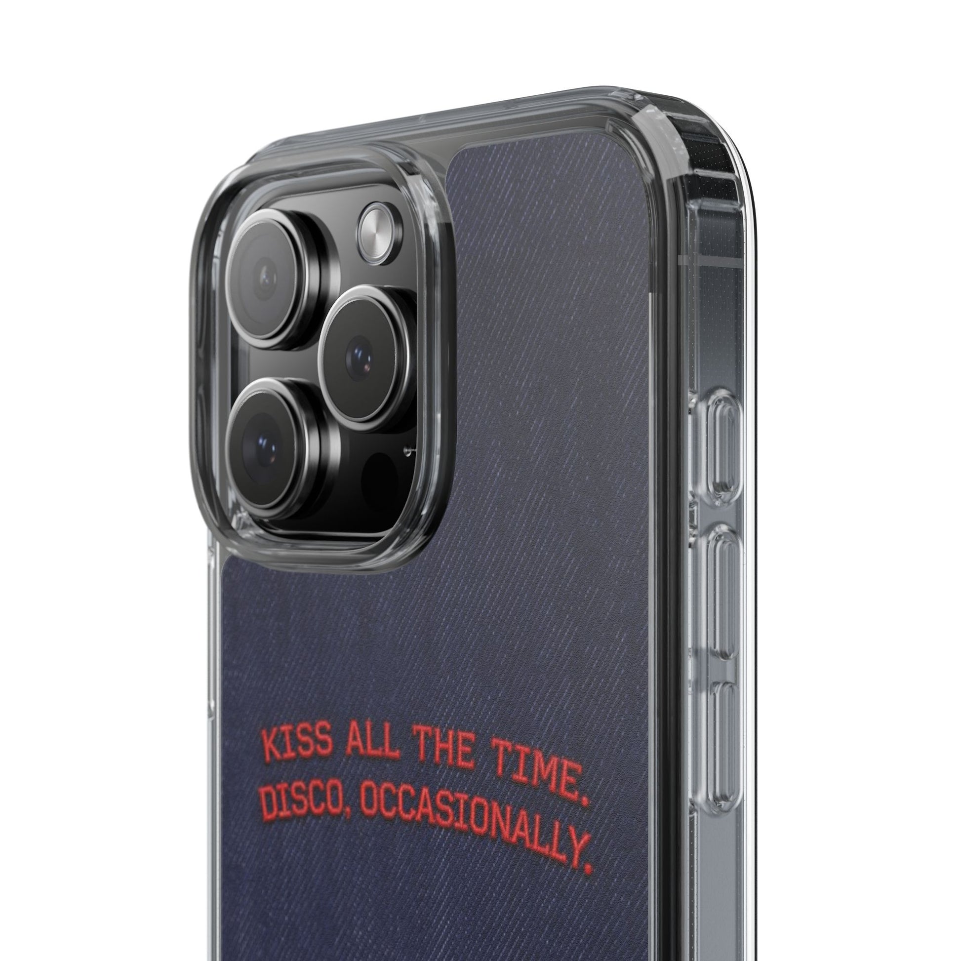 A slim, clear phone case with a deep denim backdrop and bold red embroidered text that reads: “KISS ALL THE TIME. DISCO, OCCASIONALLY.” It balances playful romance with retro flair — the clear TPU sides and polycarbonate back keep the phone lightweight and protected while letting the embroidery-style design pop. This case slips into everyday life easily: it cushions against drops, resists scratches, and supports wireless charging so you’re never uncomfortably tethered. Finished with precise cutouts and a subtle glossy frame, it’s a small, tactile reminder to keep things joyful and a little bit nostalgic every time you reach for your phone.