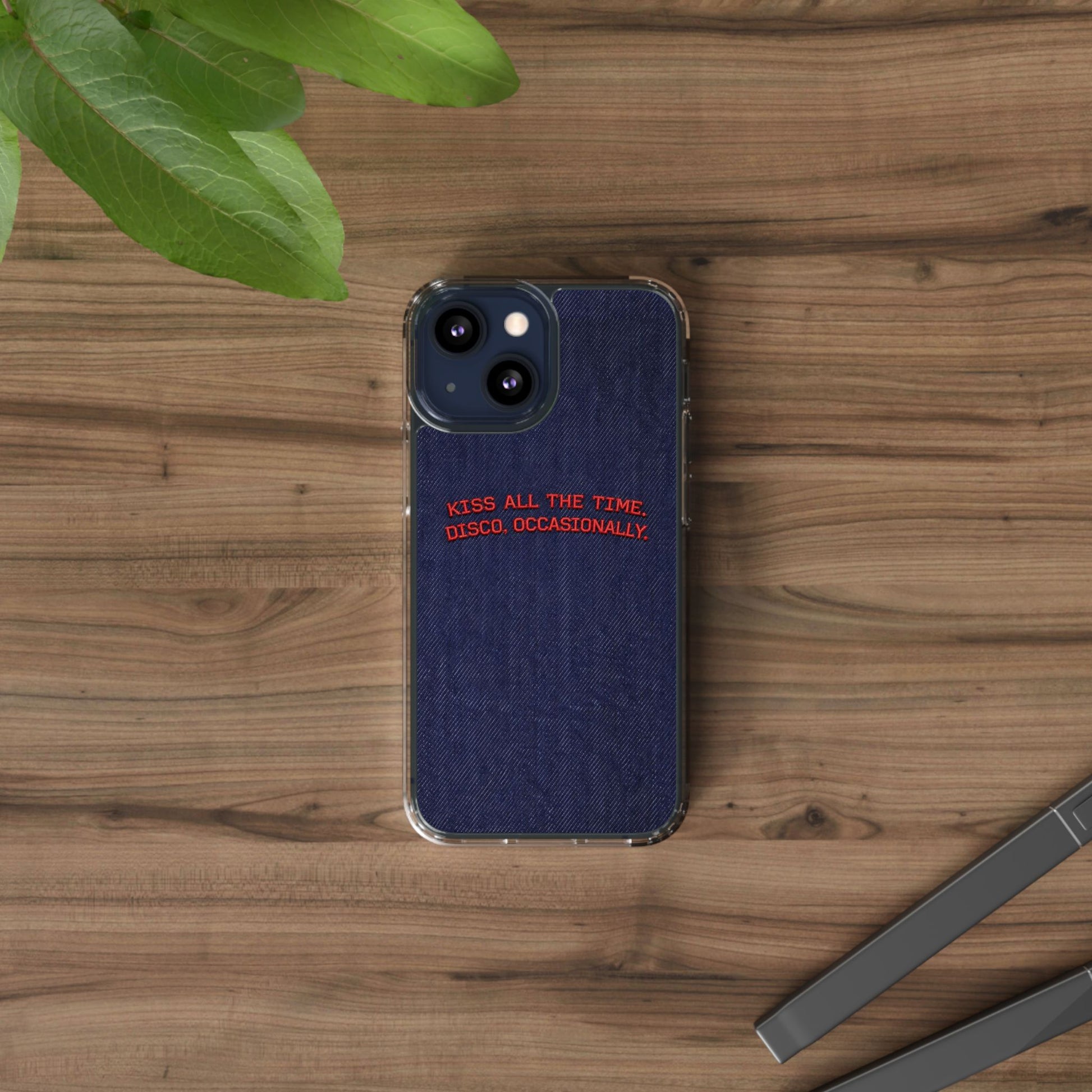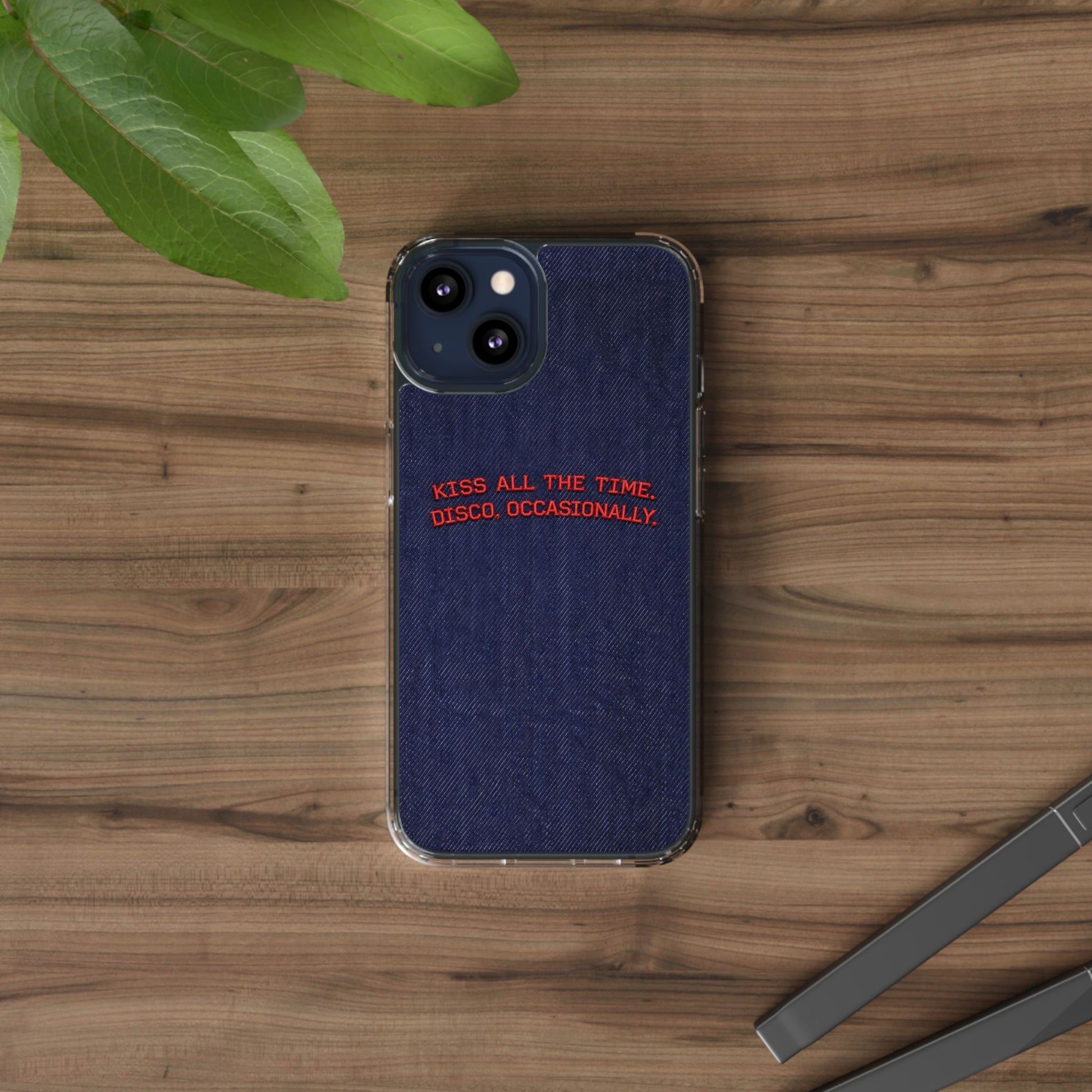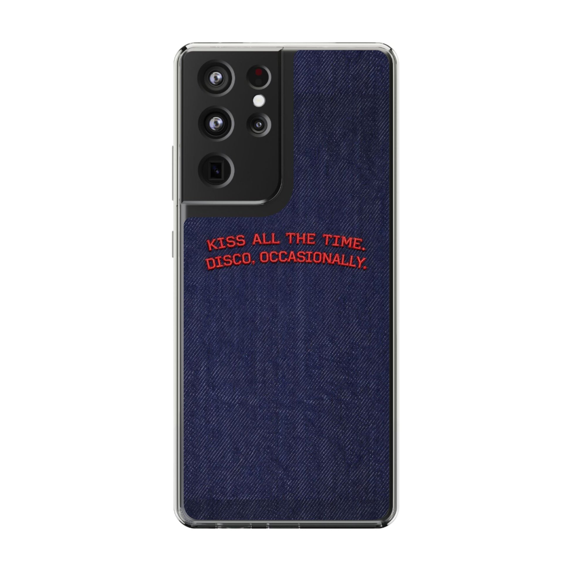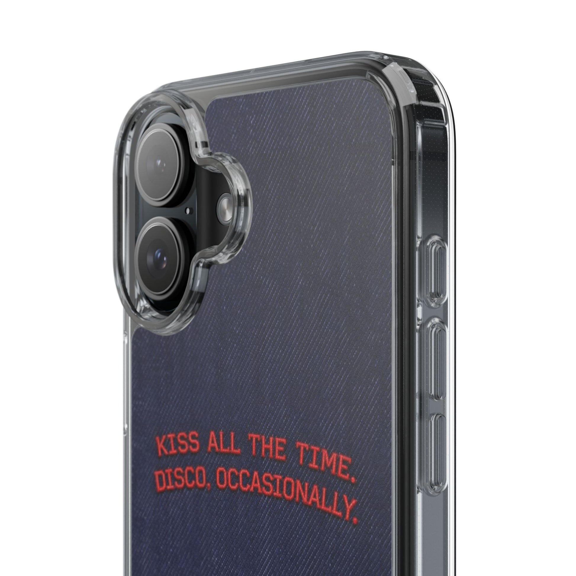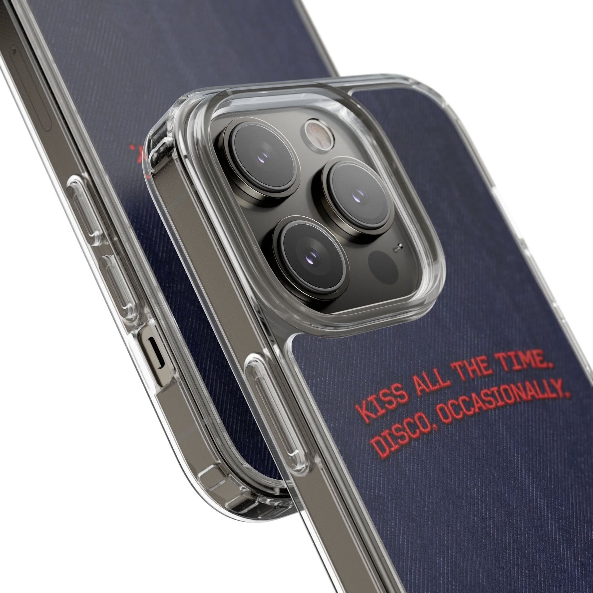 A slim, clear phone case with a deep denim backdrop and bold red embroidered text that reads: “KISS ALL THE TIME. DISCO, OCCASIONALLY.” It balances playful romance with retro flair — the clear TPU sides and polycarbonate back keep the phone lightweight and protected while letting the embroidery-style design pop. This case slips into everyday life easily: it cushions against drops, resists scratches, and supports wireless charging so you’re never uncomfortably tethered. Finished with precise cutouts and a subtle glossy frame, it’s a small, tactile reminder to keep things joyful and a little bit nostalgic every time you reach for your phone.